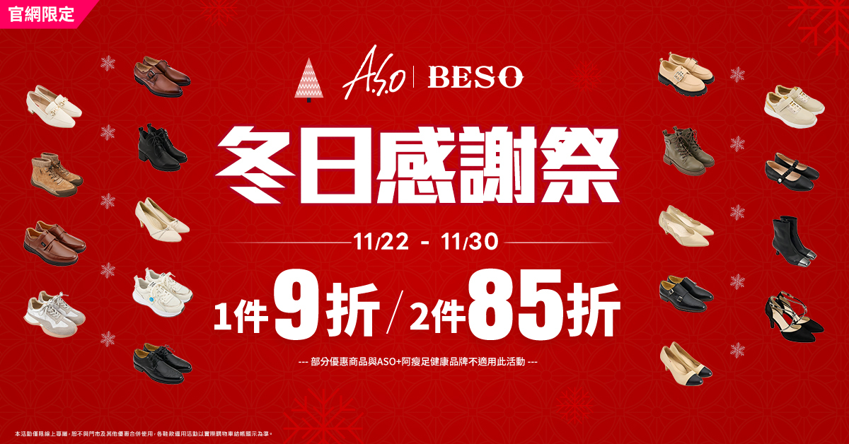 • 活動一:A.S.O、BESO 指定商品 滿 1 件 9 折;滿 2 件 85 折(部分優惠鞋款 與【ASO+阿瘦足健康】不列入此優惠)