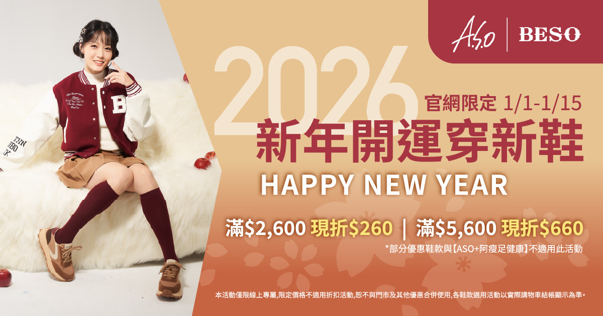 • 活動一:A.S.O、BESO 指定商品 滿 $2,600 折 $260;滿 $5.600 折 $660(特惠鞋款、週週驚喜價鞋款、限時優惠商品、ASO+阿瘦足健康_品牌商品,及其他優惠活動皆不適用此活動)